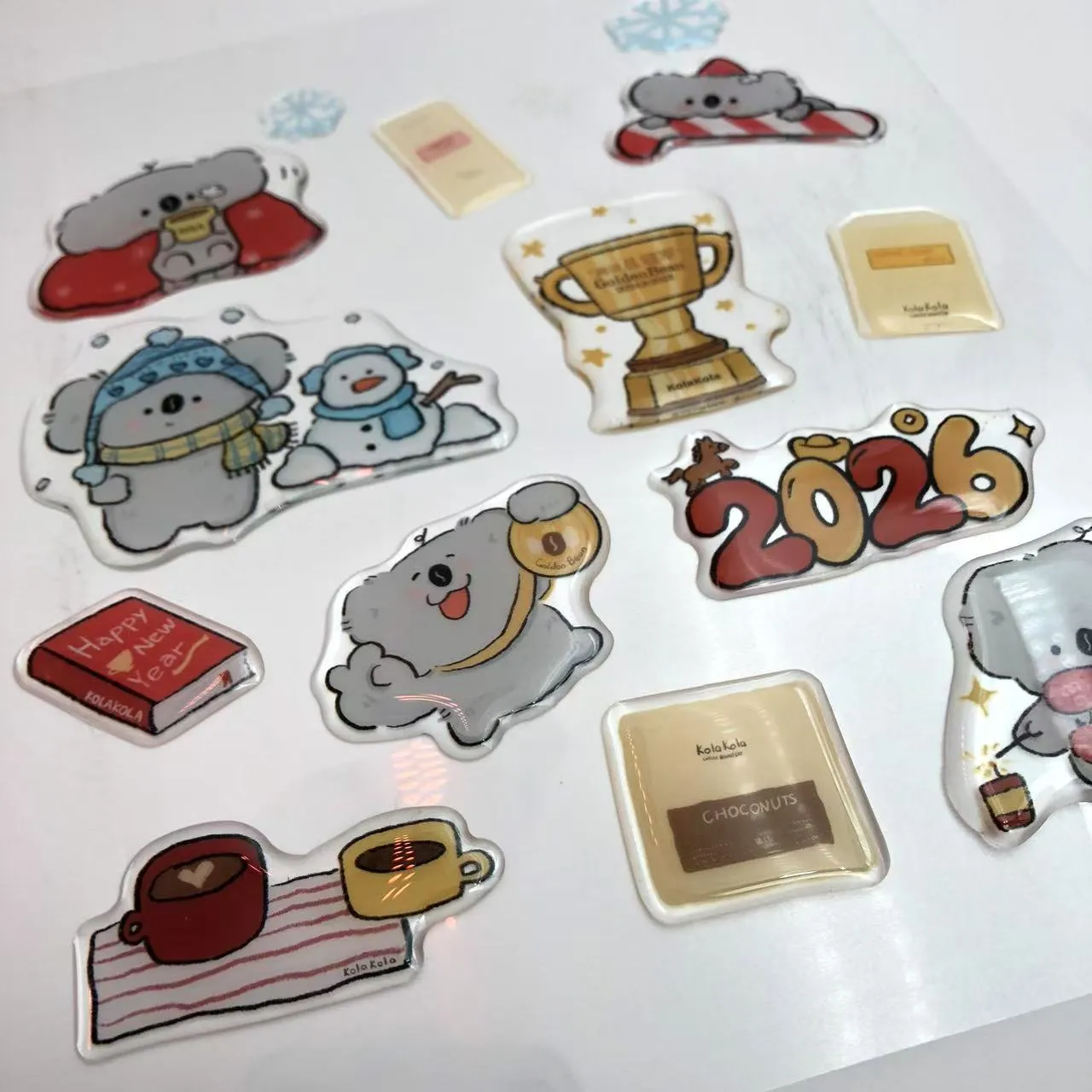 Kanggo stiker resin epoksi kartun 3D, kita nawakake bahan dasar PVC / PP sing ramah lingkungan. Kekandelan lapisan resin epoksi bisa disesuaikan saka 0.3mm nganti 1mm. Sampeyan uga bisa milih efek glitter utawa padhang kanggo nambah kreatifitas stiker. Kita nyedhiyakake rong pilihan adesif: adesif kuat standar lan adesif sing bisa dicopot tanpa residu, cocok kanggo nempel ing macem-macem permukaan kayata tembok, plastik, logam, lan kertas.