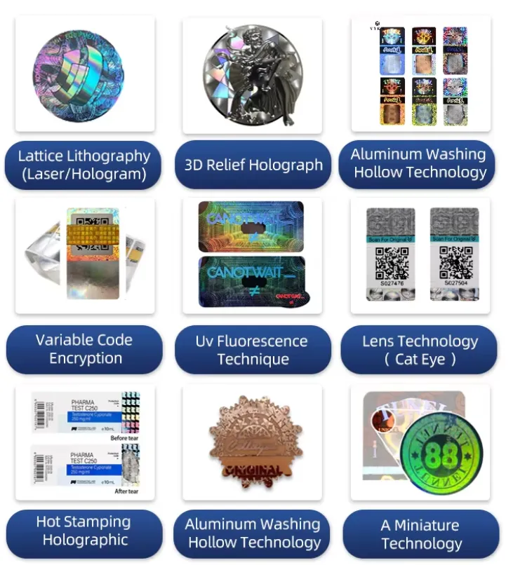 Label anti-palsuNduweni efek gambar telung dimensi lan keamanan sing dhuwur. Sticker kaya iki nyathet gambar utawa informasi tartamtu ing bentuk telung dimensi ing medium khusus liwat prinsip gangguan laser, dadi pola holographic sing angel disalin.
