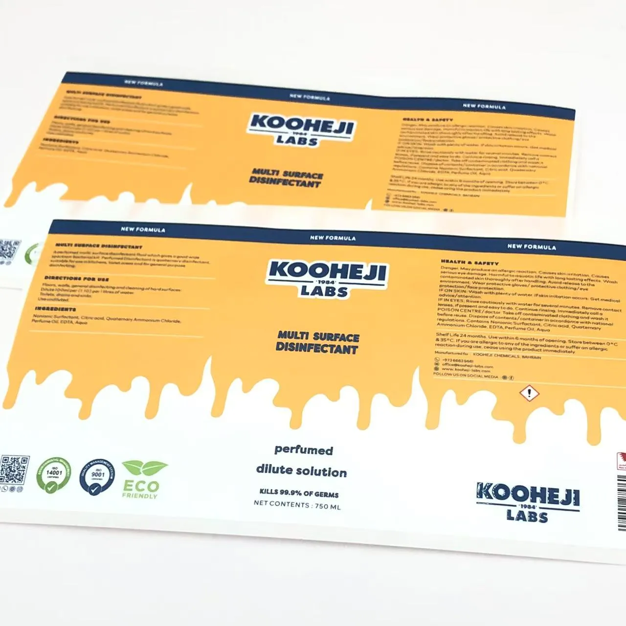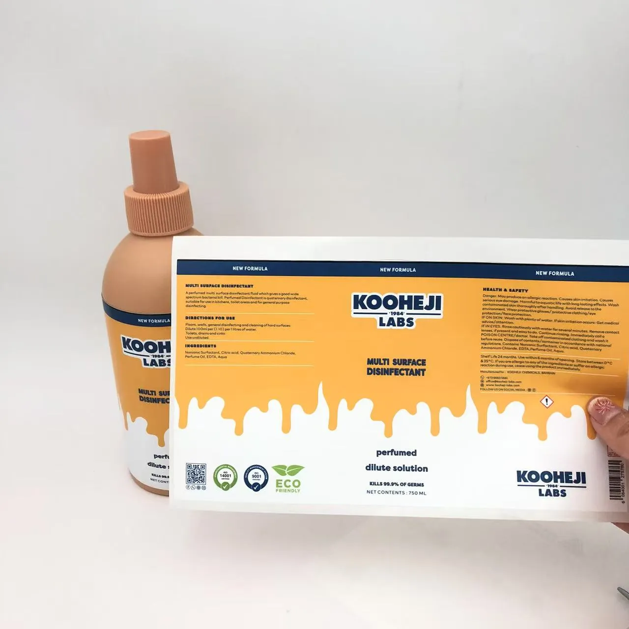Minangka pemasok label kemasan China sing dipercaya, JOJO Pack mimpin produksi label kemasan botol disinfektan, nawakake label kemasan grosir lan layanan label botol khusus. Produk kita nduweni kinerja tahan alkohol, tahan banyu. Pilih kita kanggo tuku label murah sing ningkatake nilai merek lan daya saing pasar.