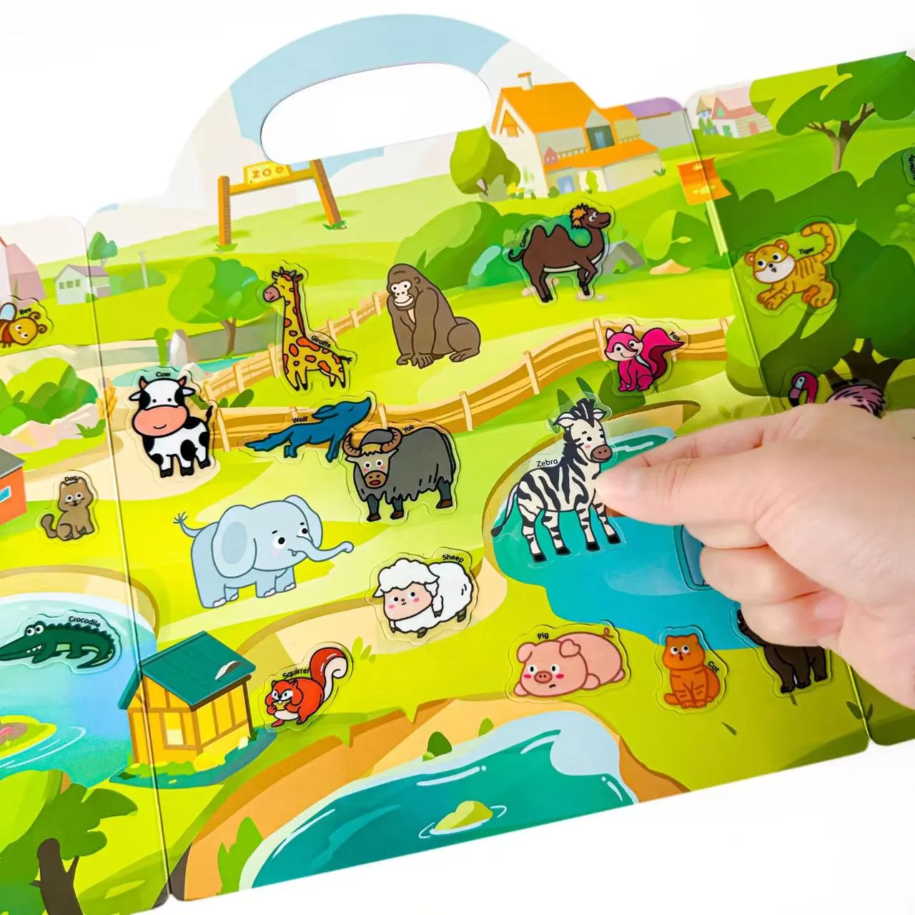 Set kasebut kalebu buku pemandangan sing ramah anti banyu + bisa digunakake maneh stiker jeli sing digawe saka bahan sing ora toksik, tahan tungkak sing ora toksan karo standar safety anak. Loro buku lan stiker dicithak karo tinta kacang kedelai lan ramah sing bermutik, njamin kekiatan lan tanggung jawab lingkungan.