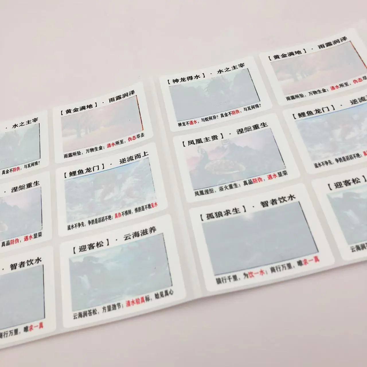 A label banyu-sensitifmateri cerdas dicithak nganggo struktur tinta basis banyu khusus. Nalika kapapar banyu utawa cairan transparan liyane, iki cepet nyerep kelembapan, nyebabake label dadi meh transparan sajrone udakara 1 detik - nuduhake pola utawa teks sing didhelikake. Sawise cairan nguap, sawetara jinis kertu bisa bali menyang kahanan asline kanggo nggunakake bola-bali.