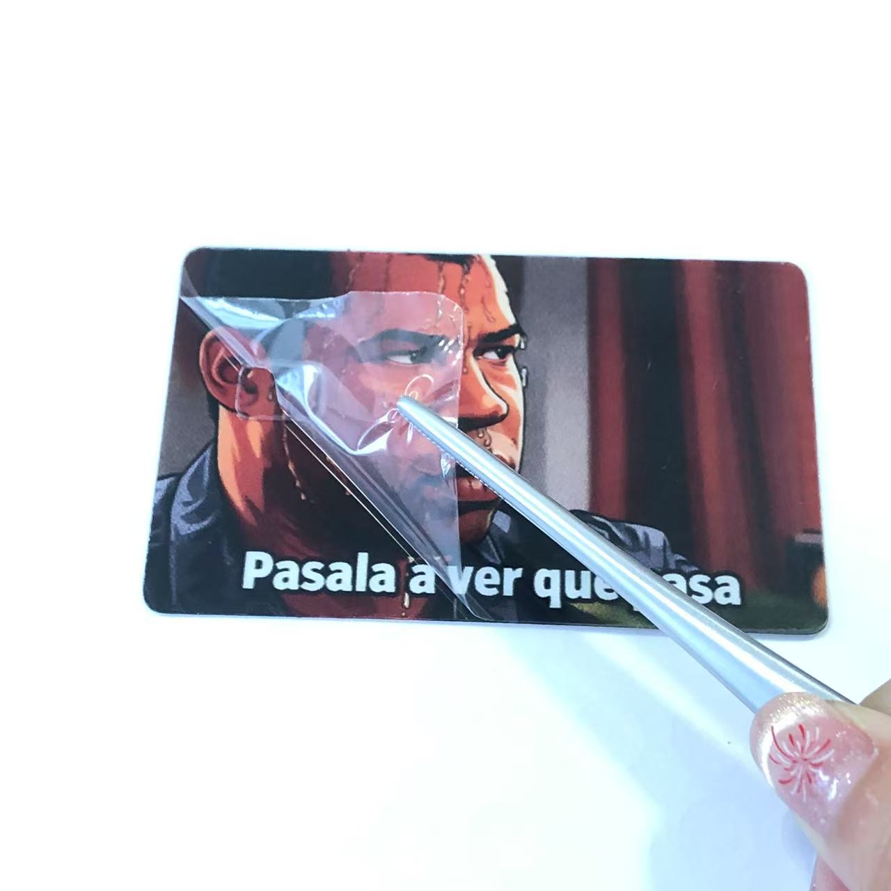 Kanggo njamin kualitas produk sajrone transportasi, saben stiker kertu kredit dilengkapi film pelindung ing permukaan. Lapisan protèktif iki kanthi efektif nglindhungi stiker saka goresan, bledug, lan karusakan potensial liyane sing bisa kedadeyan nalika transit. Sawise nampa barang kasebut, para klien mung kudu ngilangi film pelindung kanggo mbukak stiker kertu kredit sing jelas lan sregep.