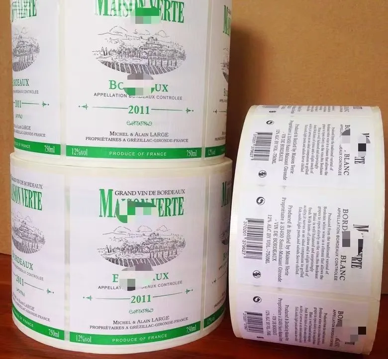 Stiker botol anggur digawe saka bahan pvc bermutu tinggi, adat PVC anti banyu sing dipasang anggur duwe banyu anggur lan resistensi kelembapan sing apik.