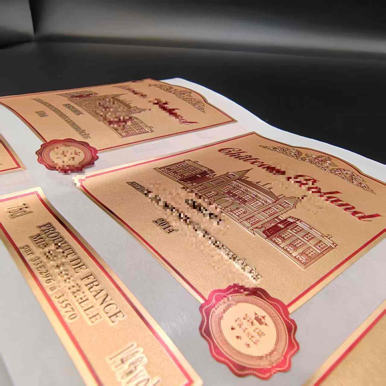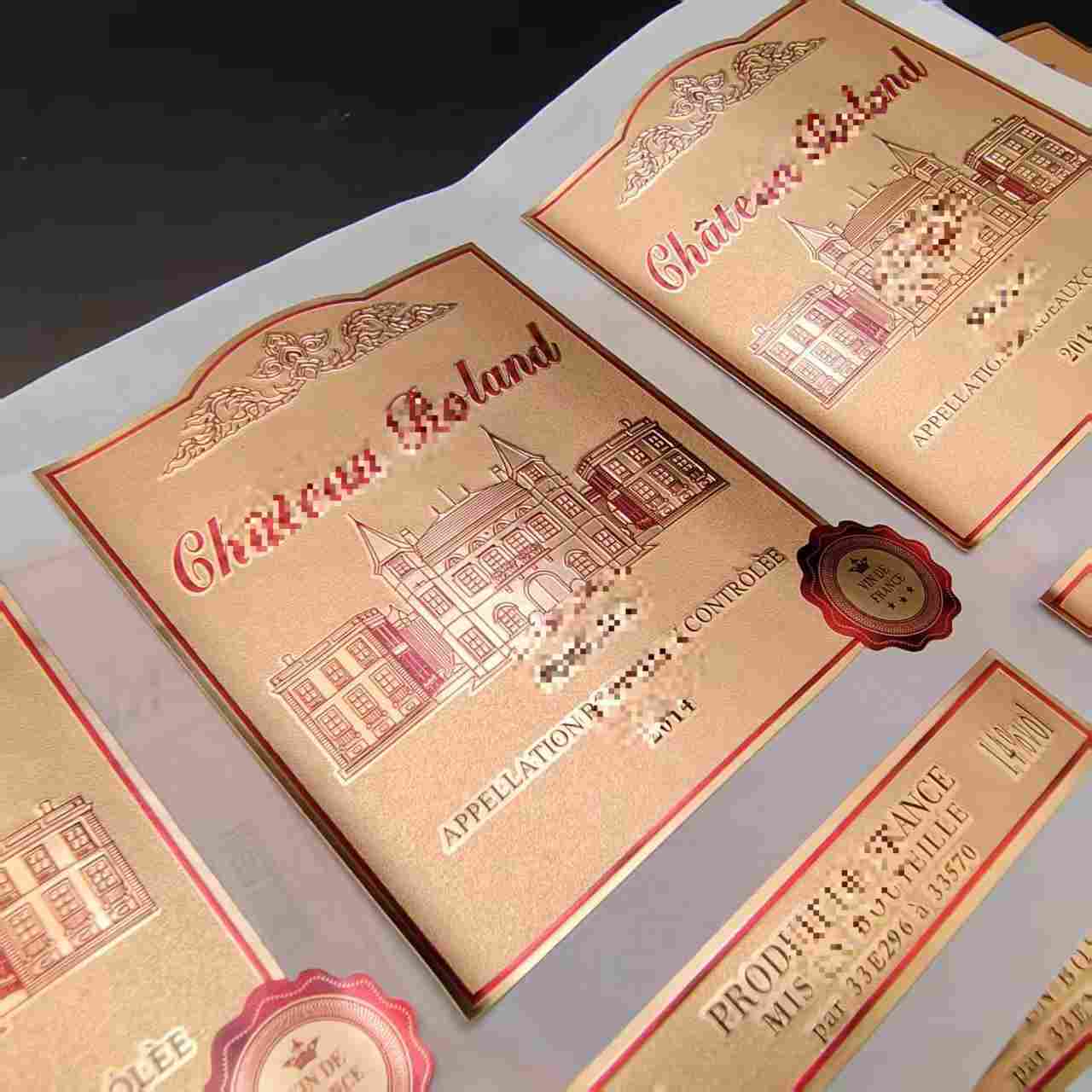 Integrasi saka gilded nambah tekstur sing dhuwur lan elegan kanggo label anggur. Apa nggunakake warna emas, salaka, utawa liyane, bisa nggawe kontras karo label label karo unsur desain label (kayata logo merek, pola, pola, utawa teks sing ana ing rak toko.